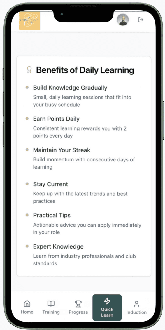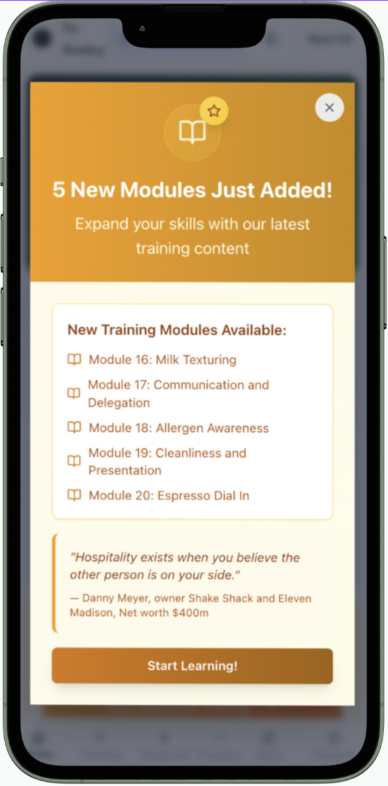 Staff receive training directly on their phones - one module at a time, with clear completion tracking.